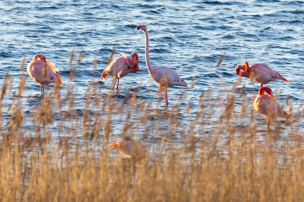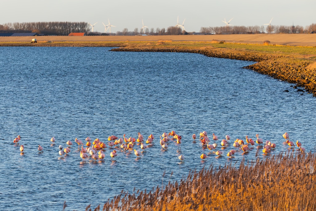Inmiddels woon ik alweer ruim vier jaar op Goeree-Overflakkee, en toen ik hier voor het eerst kwam wonen, geloofden mijn ogen mij niet. Flamingo’s, op slechts ±5 minuten van mijn huis! Regelmatig wandel ik daar met mijn hond, en het blijft een genot om deze elegante, roze vogels in het water te zien. Het is altijd weer een wonder om ze zo dicht bij huis te hebben.