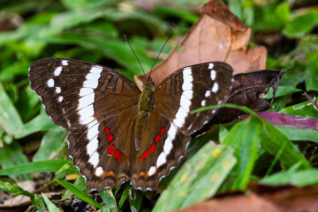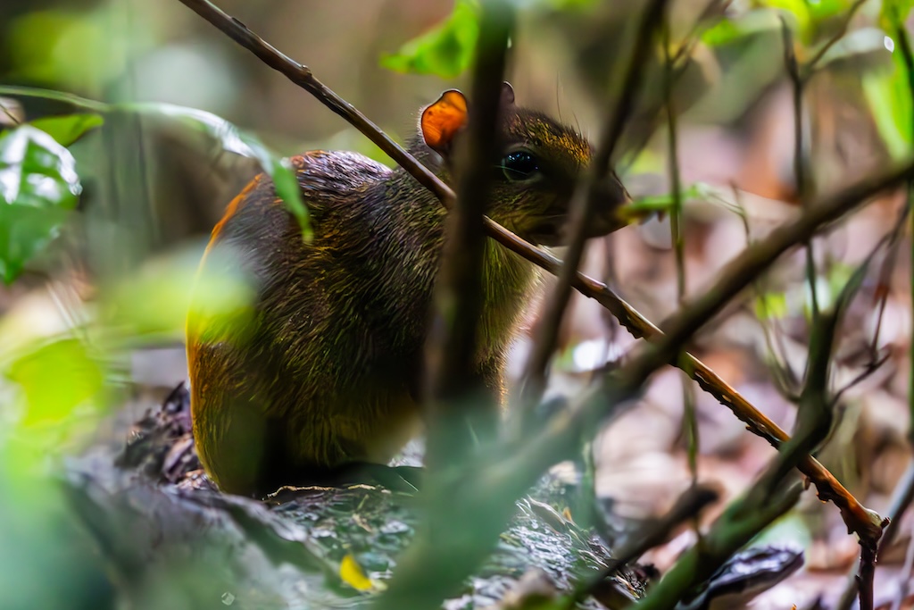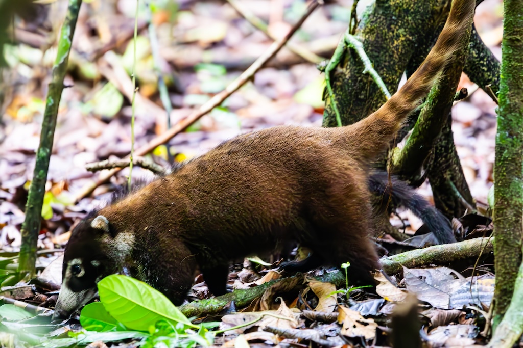 Daarnaast zagen we een groep witsnuitneusberen, maar die renden van me weg, dus ik zag vooral konten in het donker. Gelukkig kreeg ik nog één foto met een gezichtje. Het was heel lastig om tussen alle bomen en struiken door in het donker een goede foto te maken.