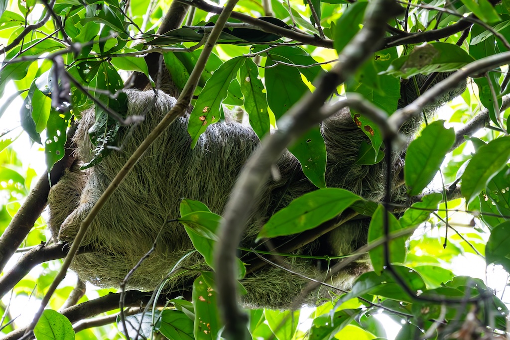 Nelly had de dag ervoor een luiaard gezien aan het begin van de tour. Hoe zij het beest had gevonden, is mij een raadsel. Hoog in de boom zagen we een beetje grijs vachtje. Het beest lag te slapen, waardoor het hoofdje helaas niet zichtbaar was. We hebben vier verschillende luiaards gezien, hoog in de bomen, maar geen van allen liet het schattige gezichtje zien.