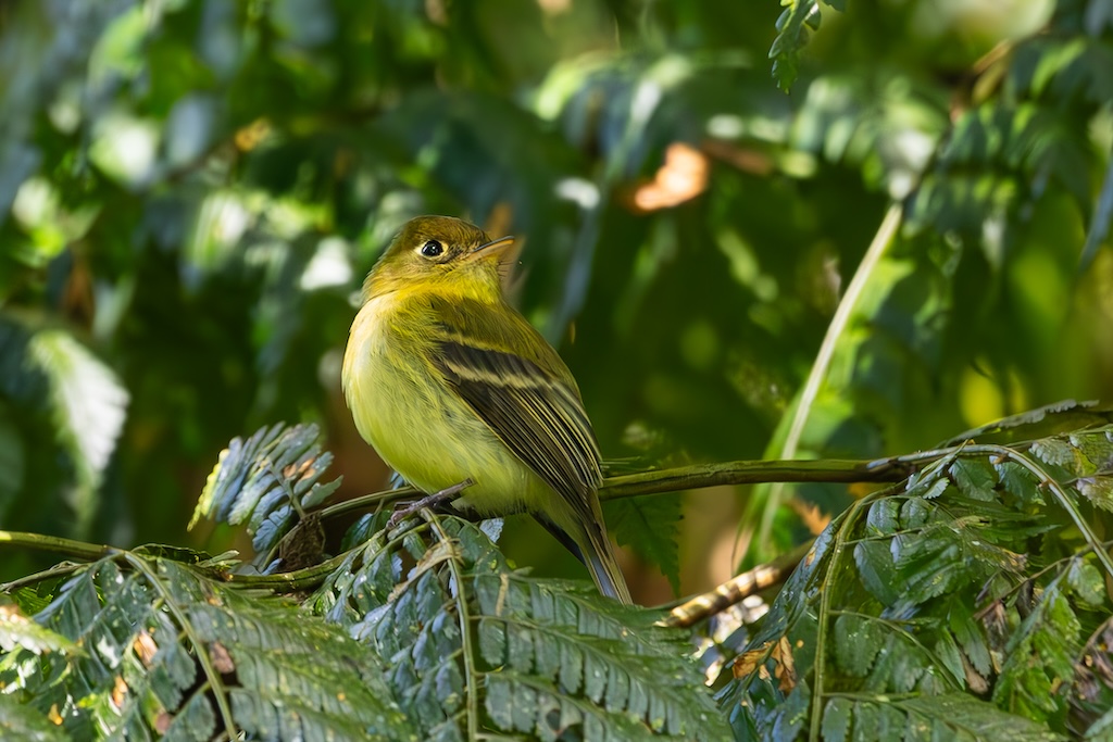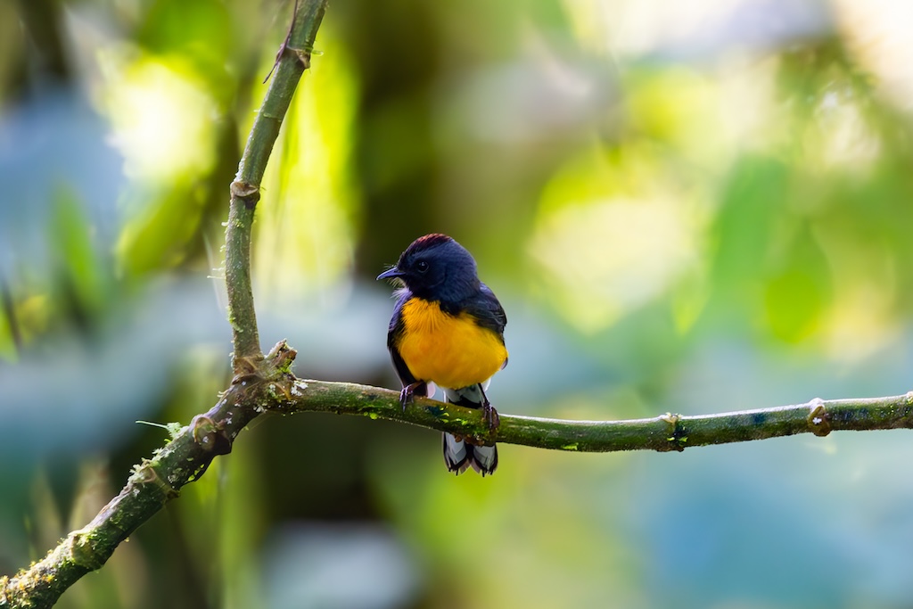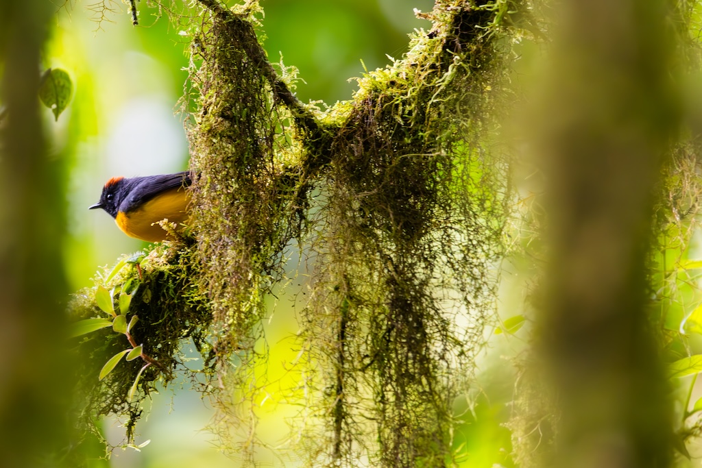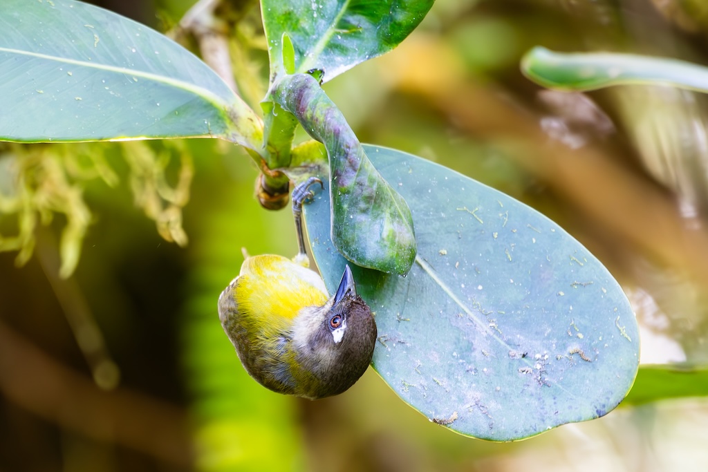 Drie bruggen verder hoorde ik wat getjiep. Goed zoekend zag ik een klein geel vogeltje, de Bruinkaporganist (Tawny-capped euphonia). Later zag ik nog een heel acrobatische Costa Ricaanse zanger (Black-eared warbler), een Chlorospingus en een Gele Feetiran. En daar eindigde het dan. Geen kleurrijke vogels, geen Quetzal, geen MotMot of andere felgekleurde vogels. Het bleef bij zeer kleine bosvogeltjes. Jammer!
