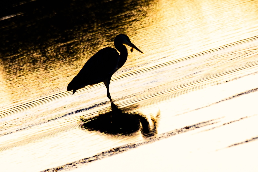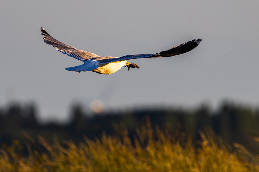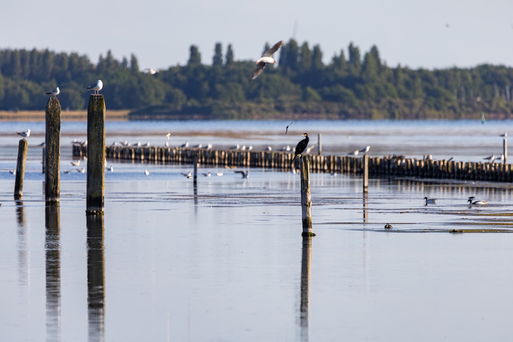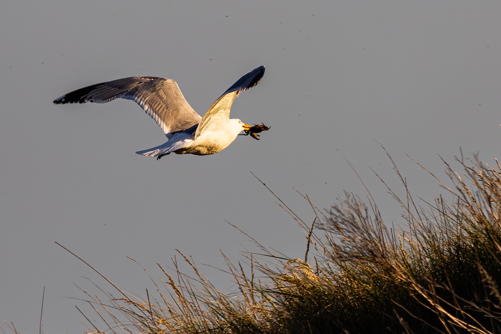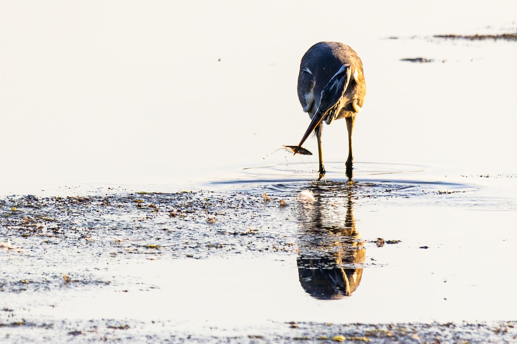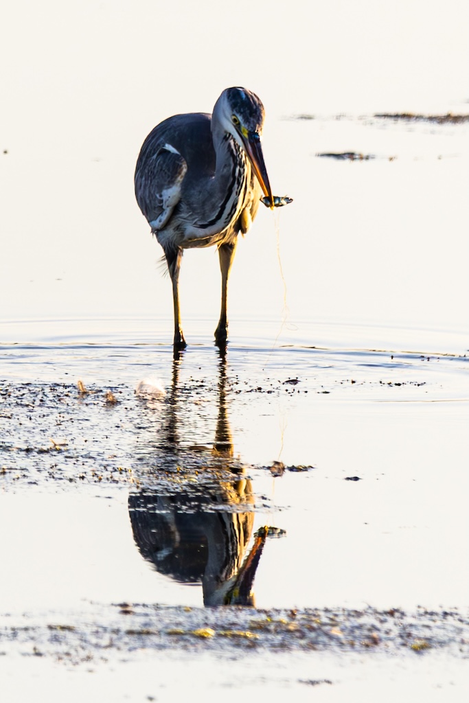 In de verte zag ik een blauwe reiger die rustig visjes stond te vangen, en iets dichterbij had een meeuw een krab in zijn snavel geklemd. Een fascinerend gezicht.
