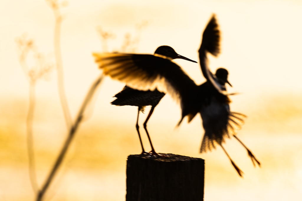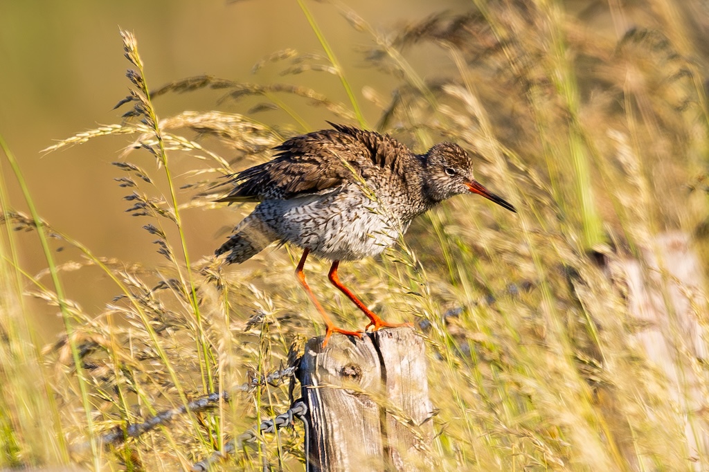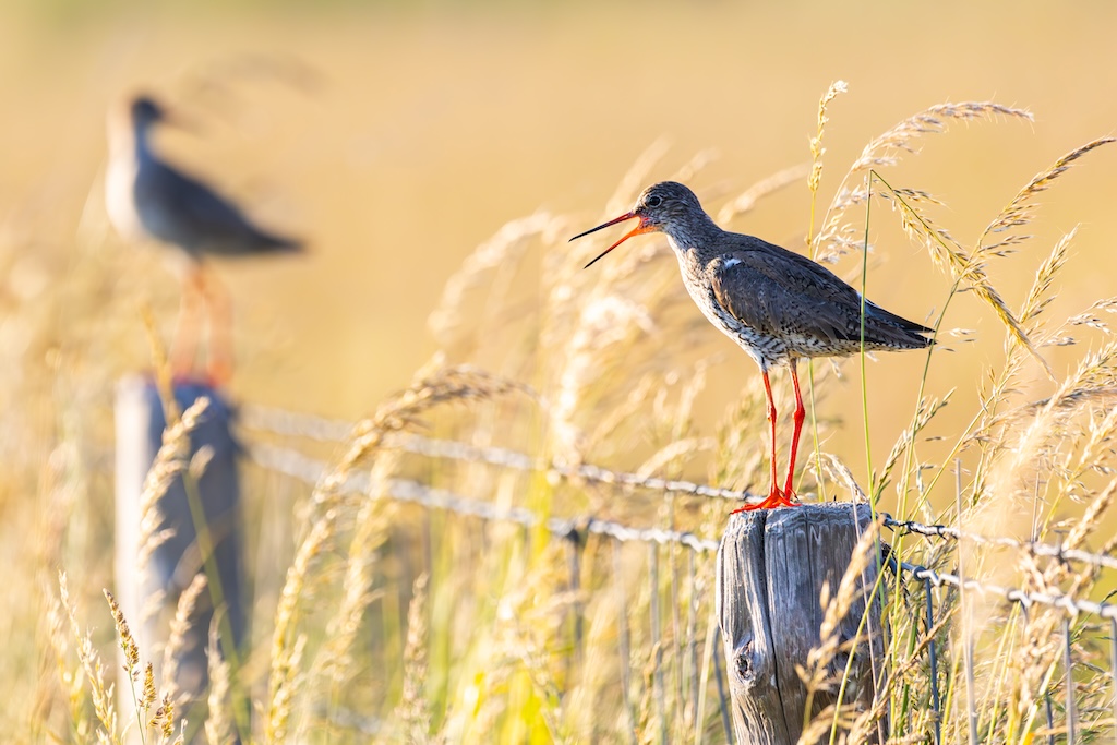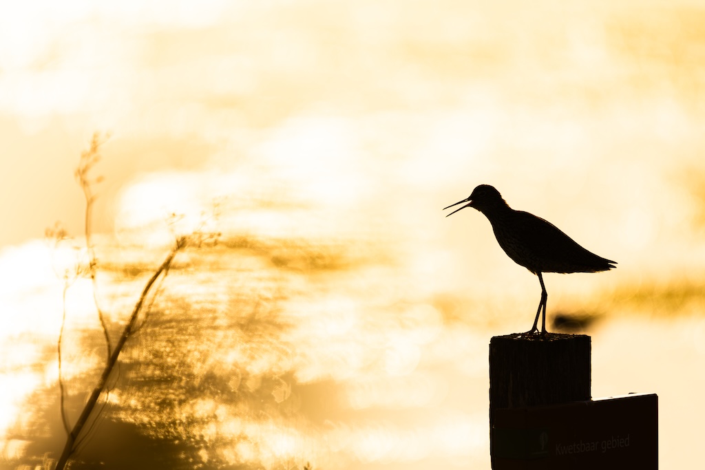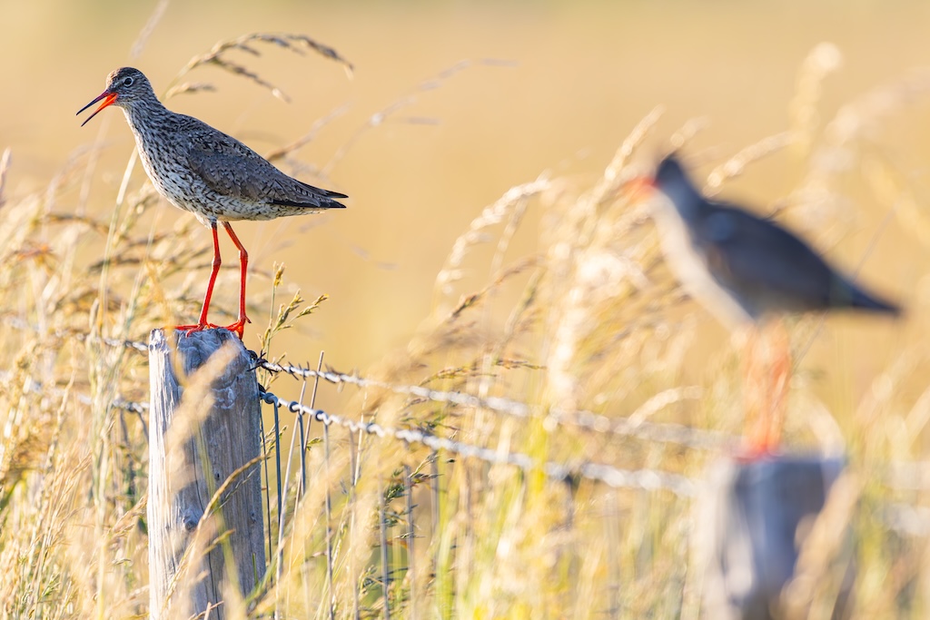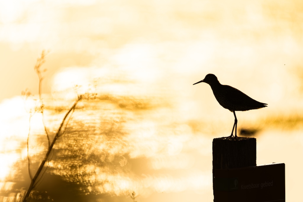 Iets verderop werd ik bijna geraakt door een laag overvliegend paartje tureluurs. Wat een energieke vogels zijn dat toch — altijd druk, altijd roepend. Ik vind ze geweldig. En ik heb er, al zeg ik het zelf, een paar prachtige foto’s van kunnen maken met de ondergaande zon.