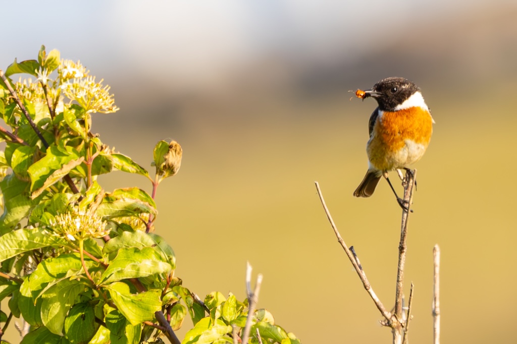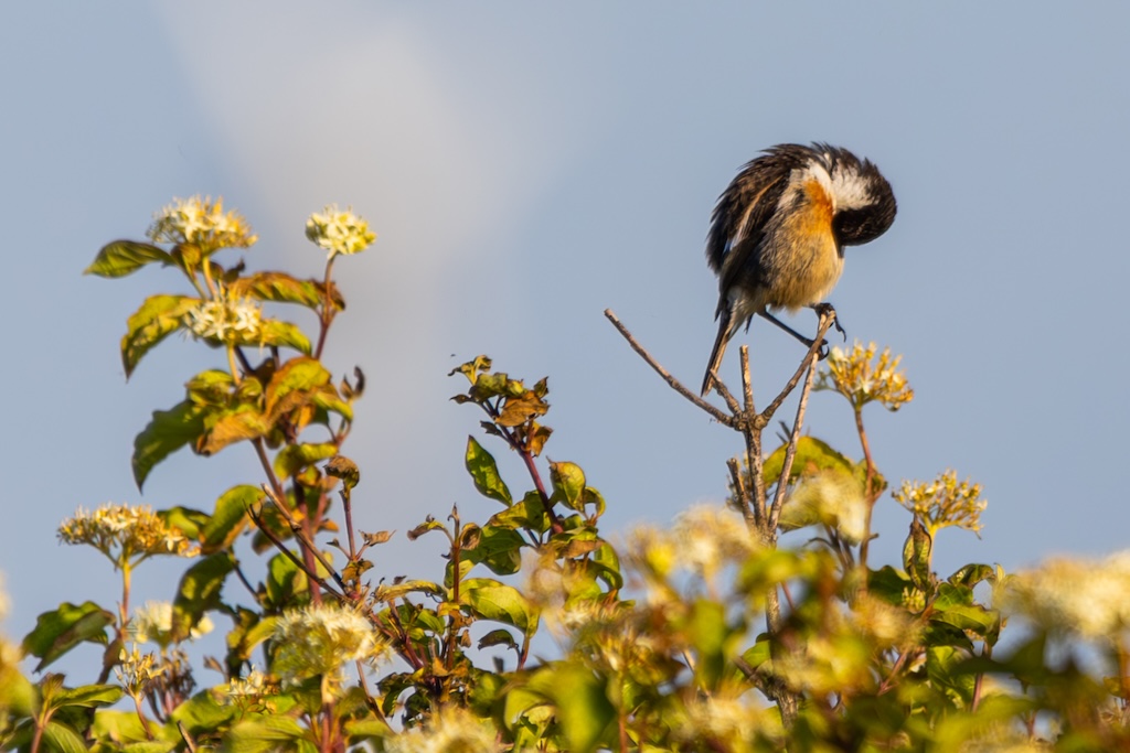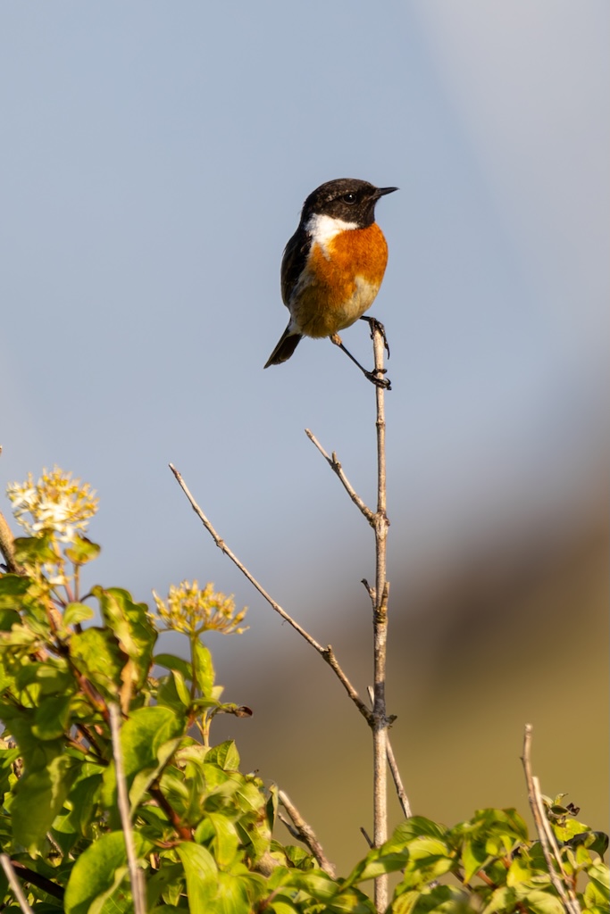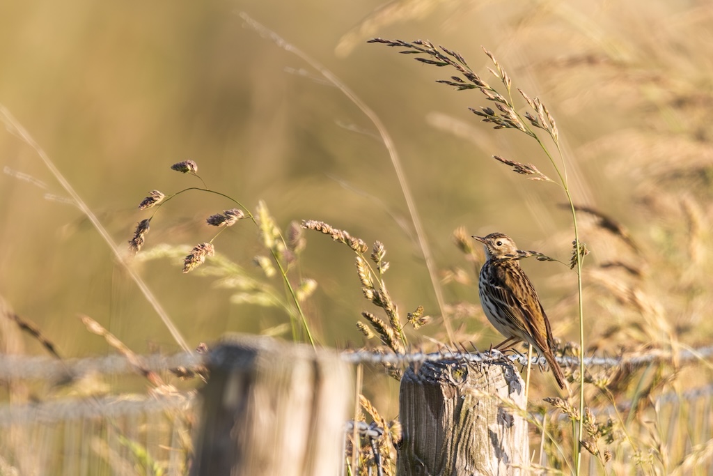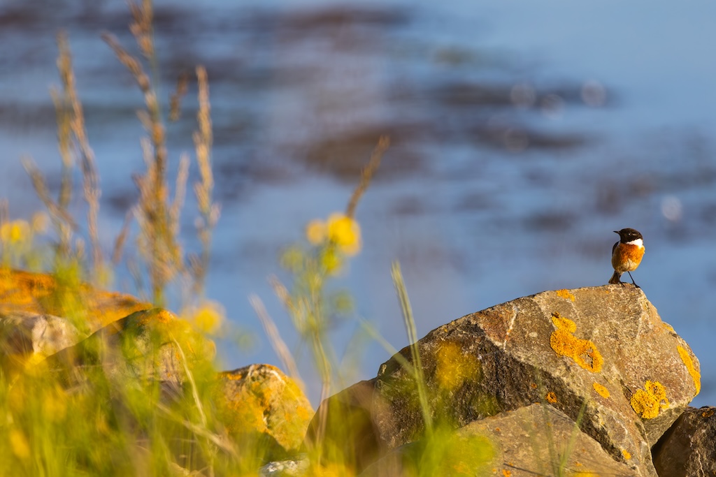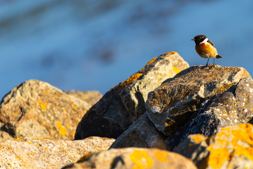 Even later zag ik een graspieper rusten op een paaltje, en kort daarna vloog een roodborsttapuit voorbij, die op de stenen bleef zitten en zijn kenmerkende roep liet horen.
