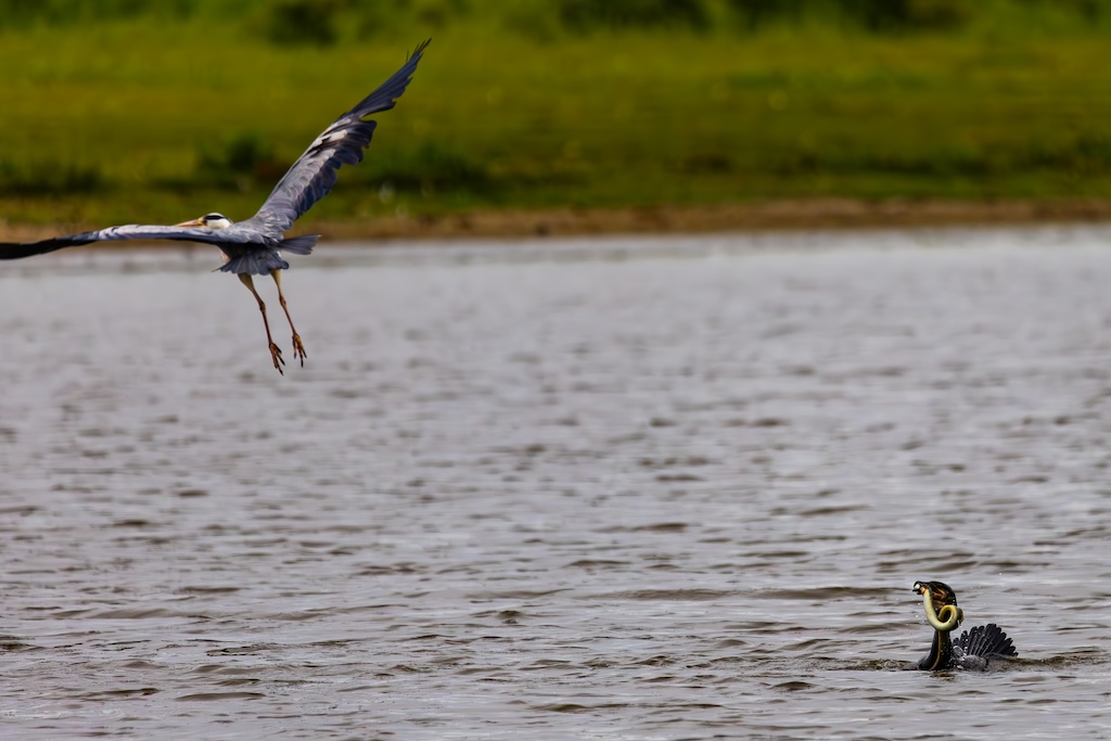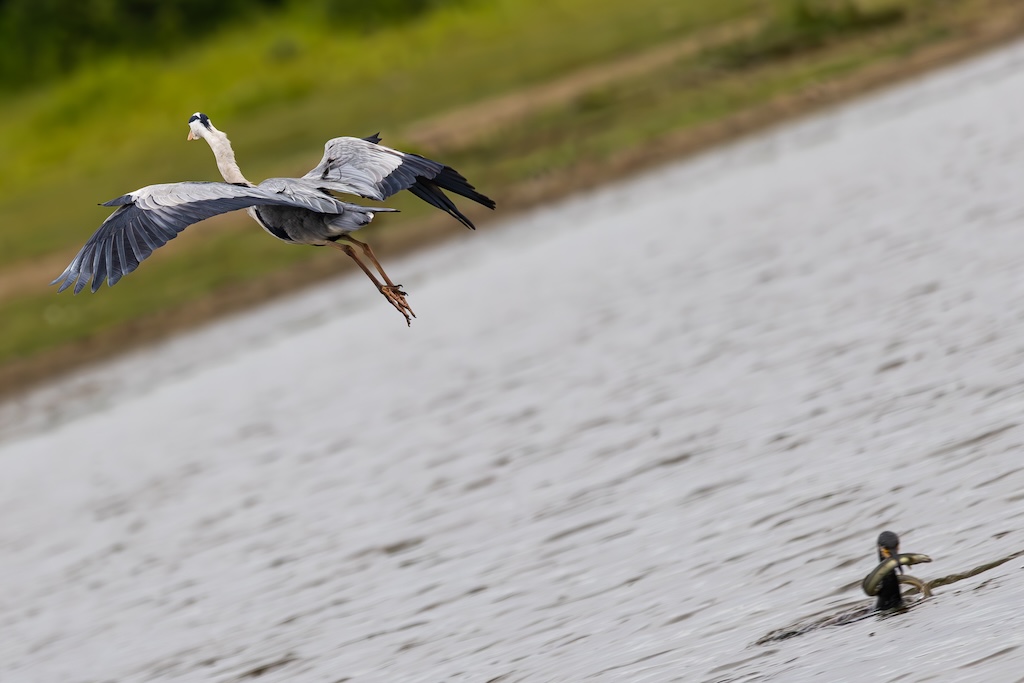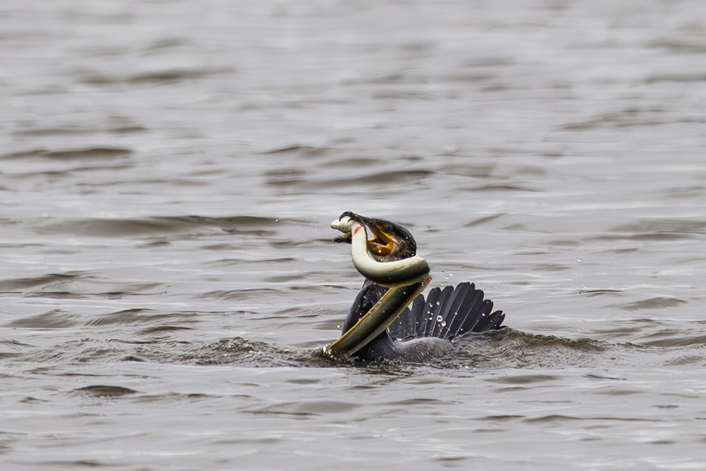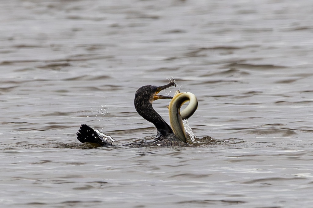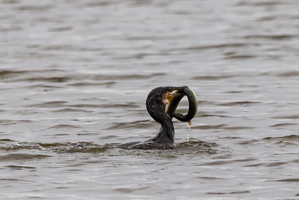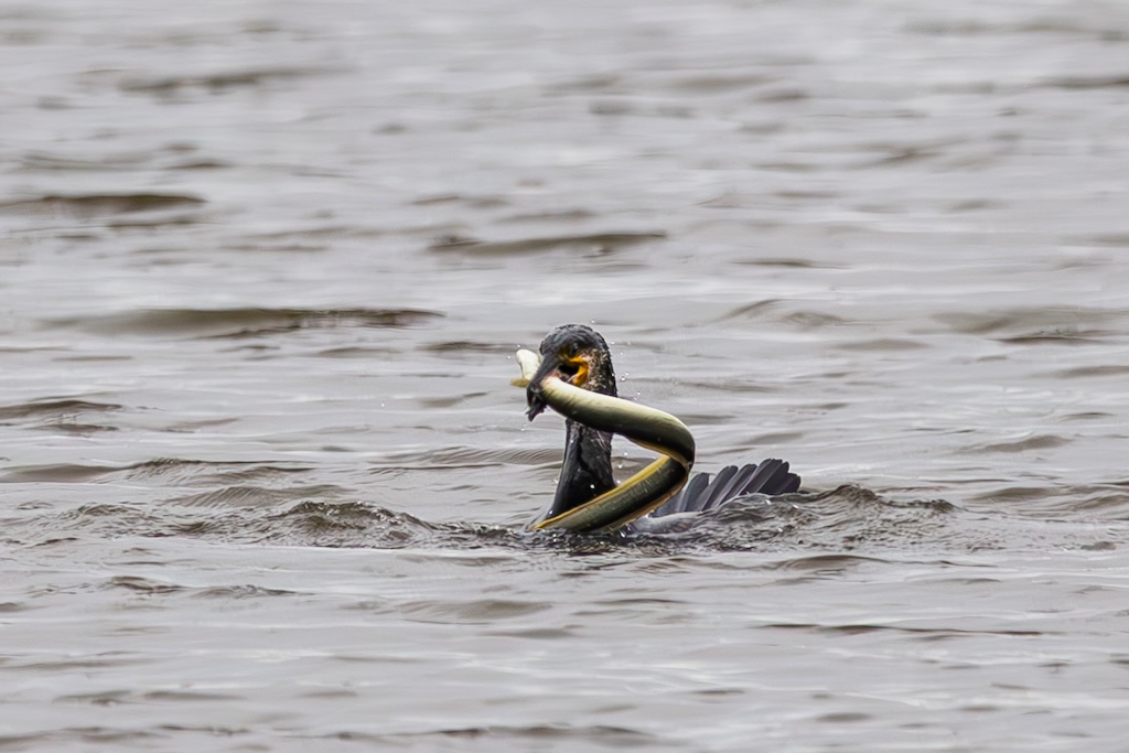 Vogelkijkhut De Lepelaar ligt halverwege de N59. Daar moet je een vervelend trapje op en weer af, en nog geen 50 meter verder staat het observatiehutje. Op dit moment zitten er honderden ganzen. Hier zag ik ook een aalscholver die zijn naam eer aan deed: druk in gevecht met een aal! Helaas op flinke afstand, waardoor ik de foto’s flink moest croppen. Maar ik heb zeker genoten van dit spektakel! Uiteindelijk verdween de paling in zijn geheel door de keel van de aalscholver. WOW!
