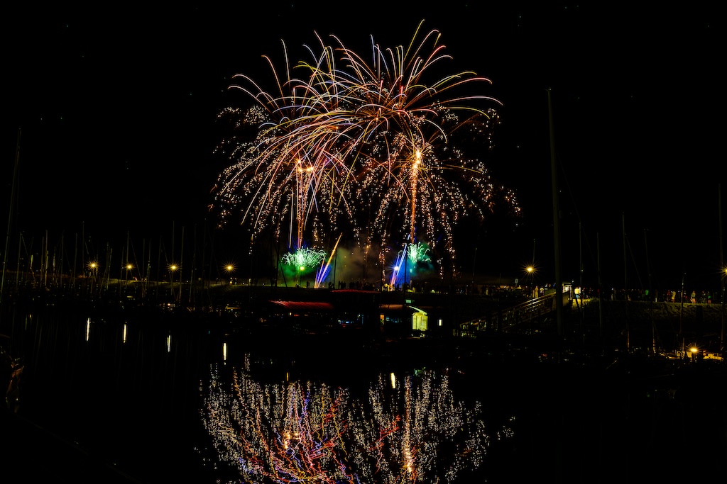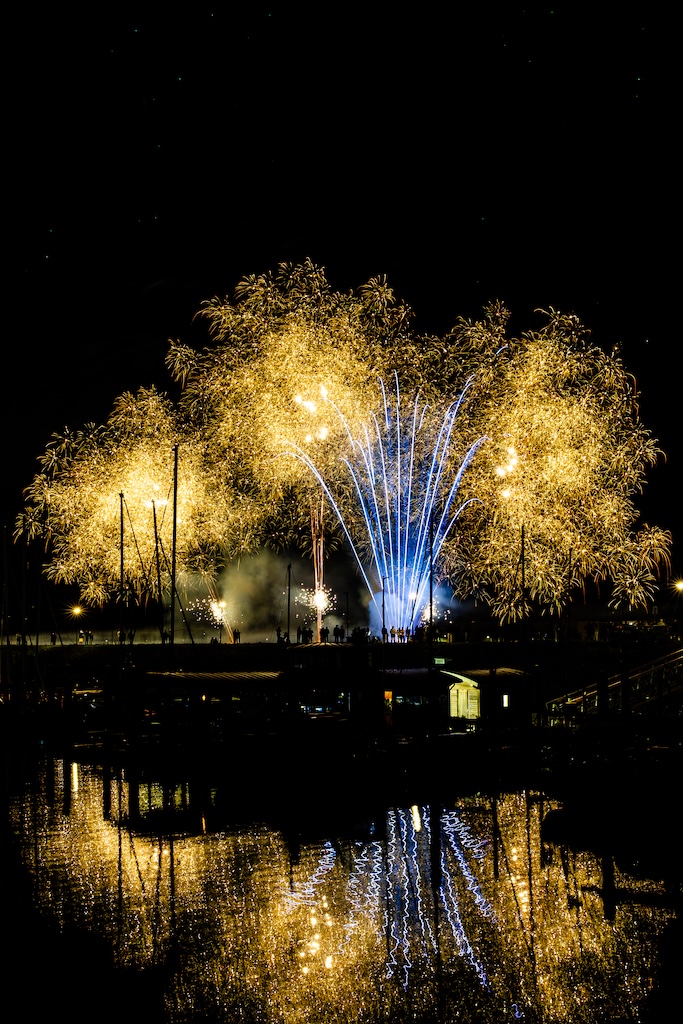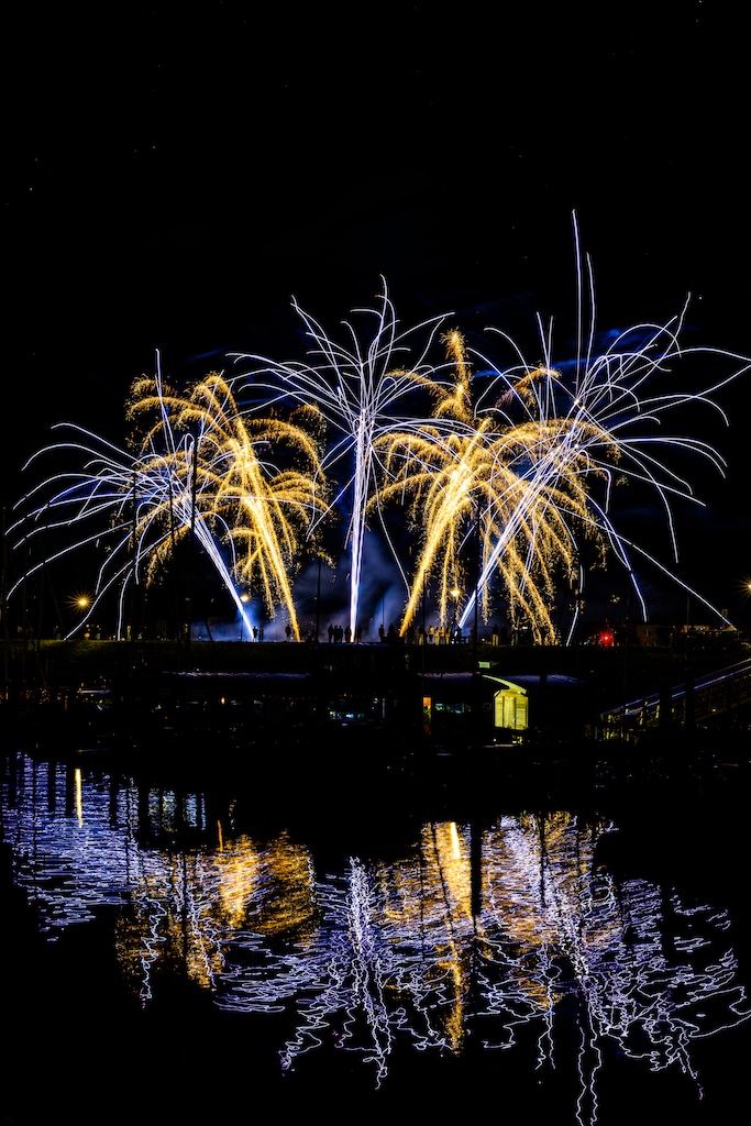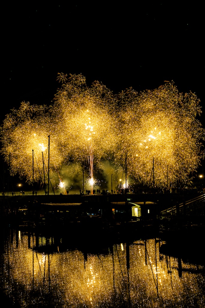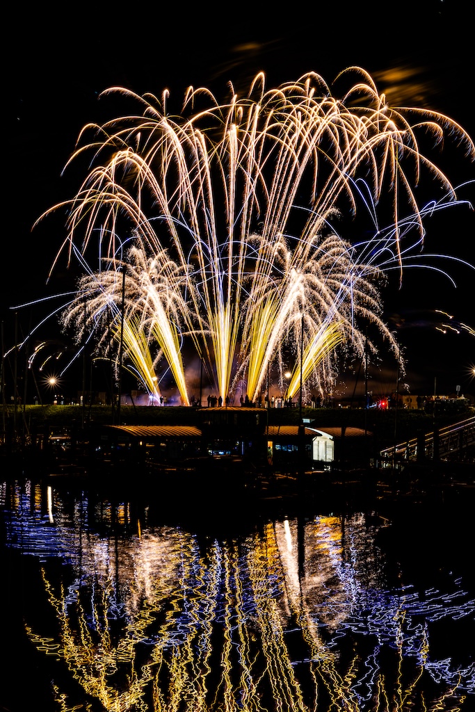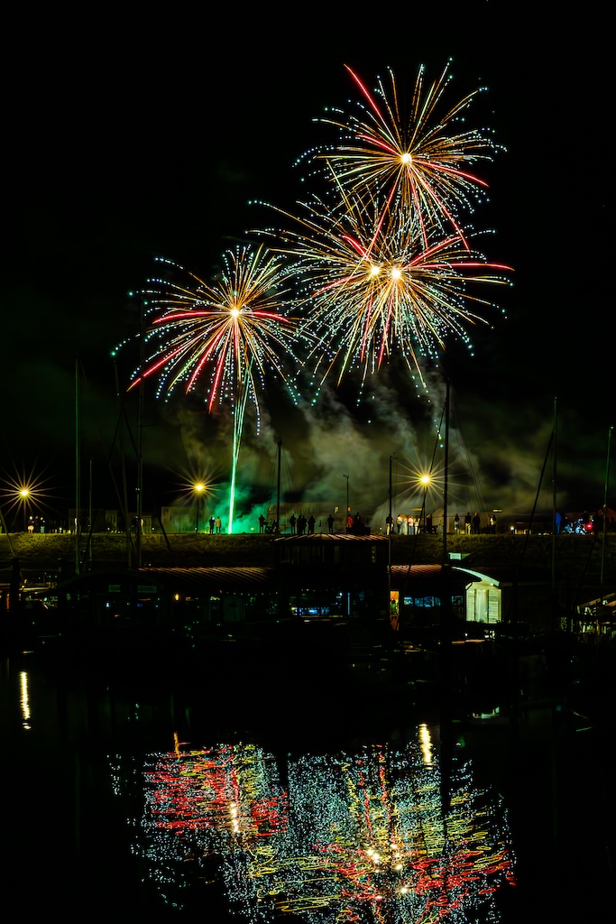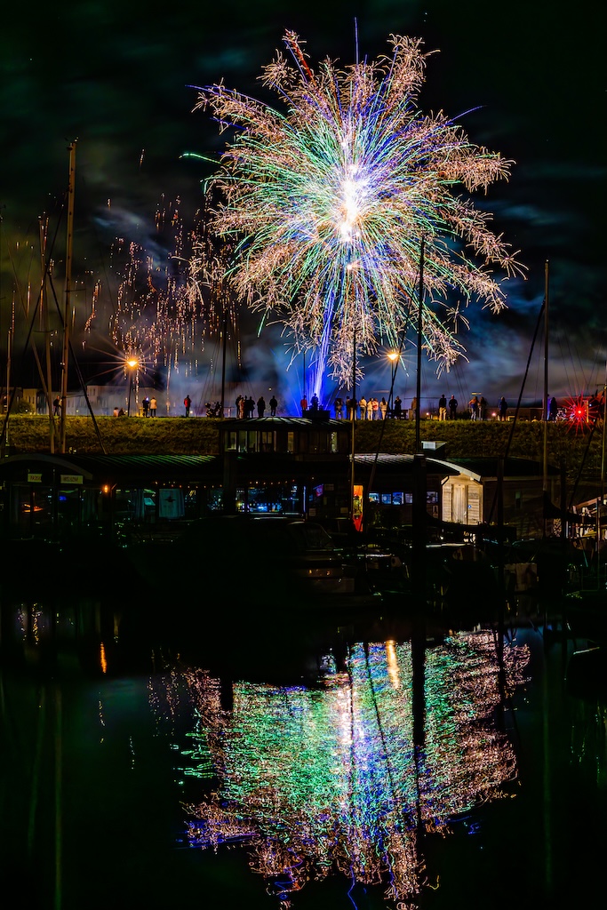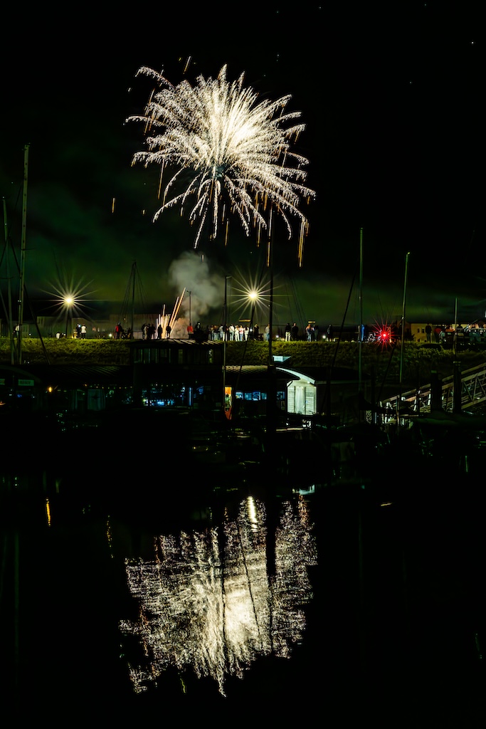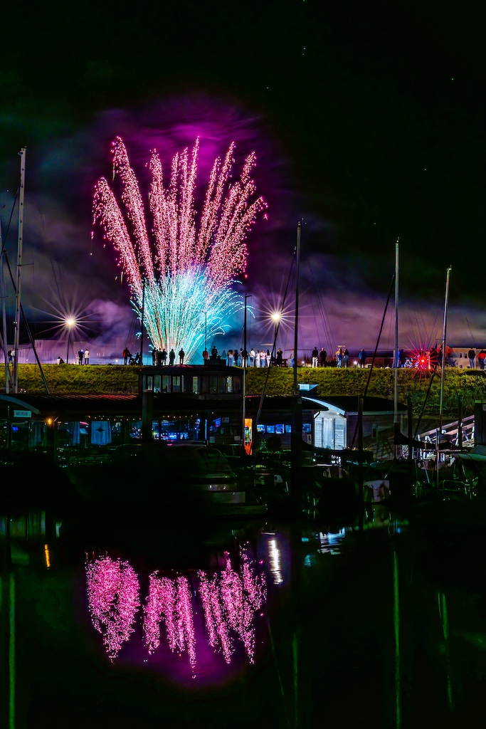 Mijn idee was om de haven met bootjes te laten oplichten door het sierlijke vuurwerk. En dat is deels gelukt! Ik stond gelukkig aan de goede kant van de haven. Maar het was erg donker, dus ik moest flink aan de foto’s sleutelen om de bootjes zichtbaar te krijgen.