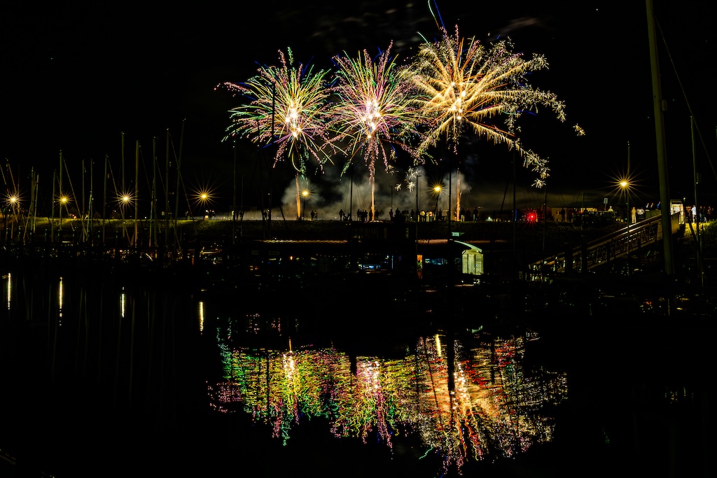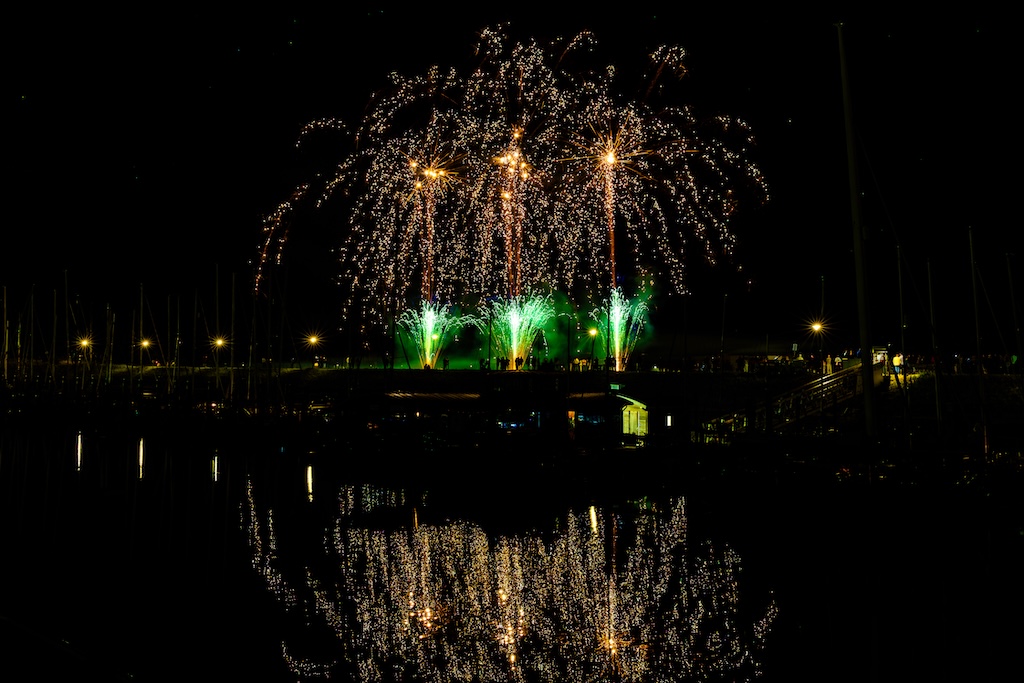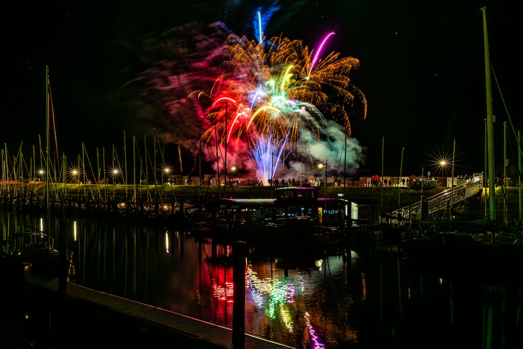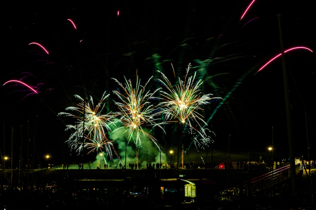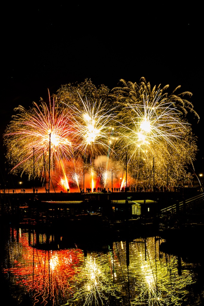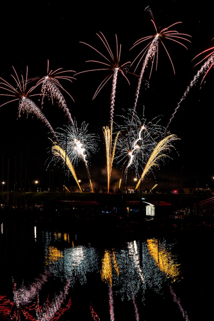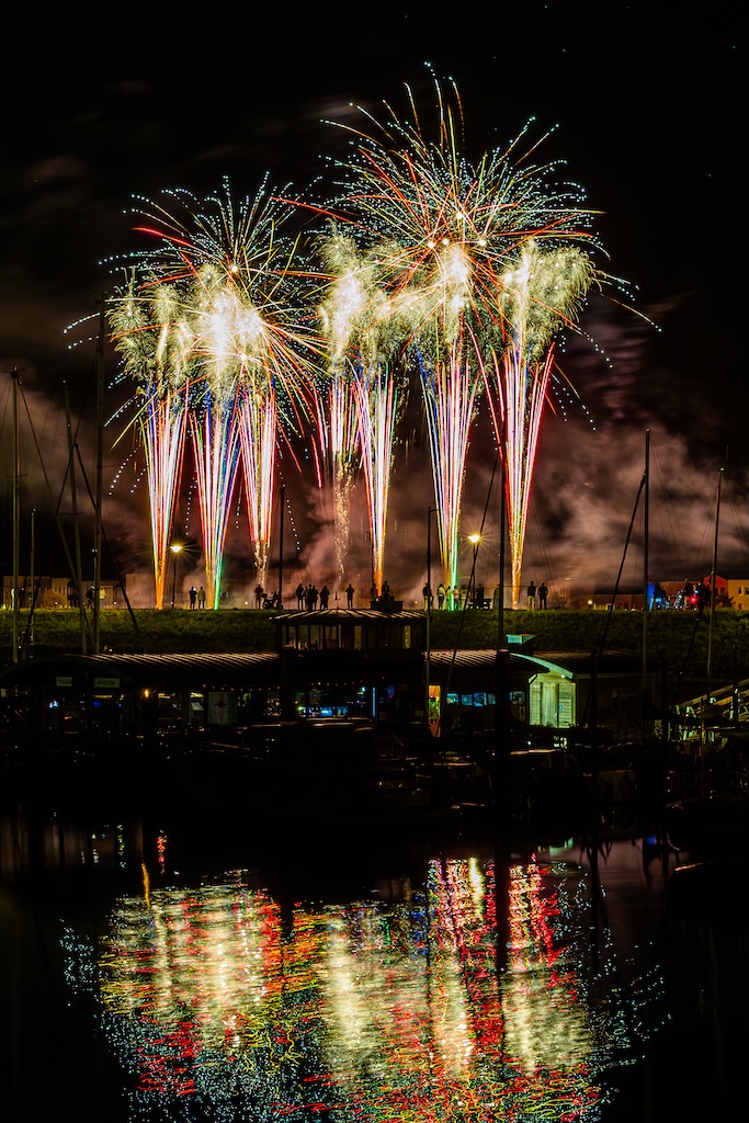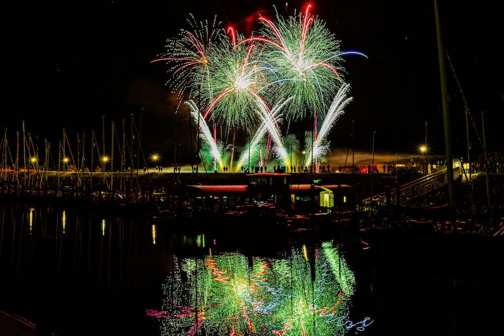 Mijn idee was om de haven met bootjes te laten oplichten door het sierlijke vuurwerk. En dat is deels gelukt! Ik stond gelukkig aan de goede kant van de haven. Maar het was erg donker, dus ik moest flink aan de foto’s sleutelen om de bootjes zichtbaar te krijgen.
