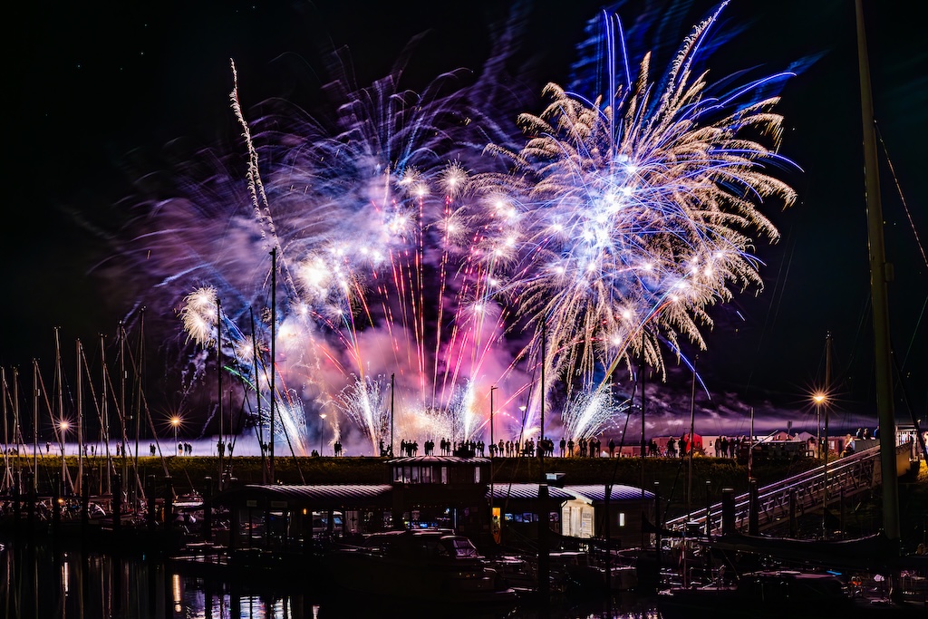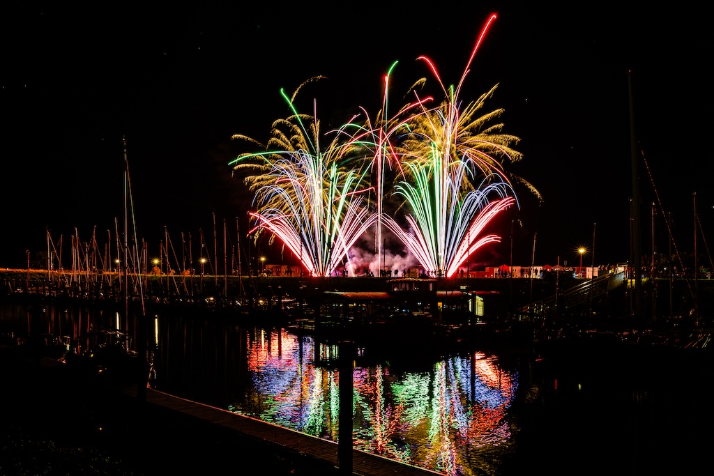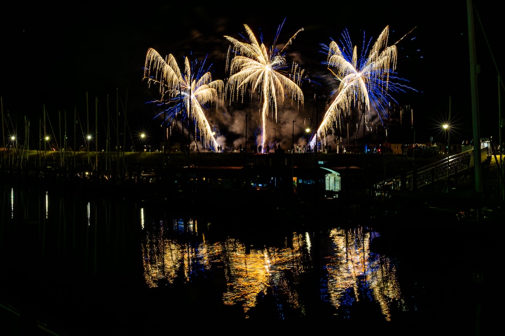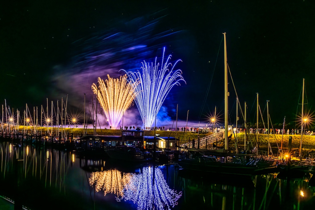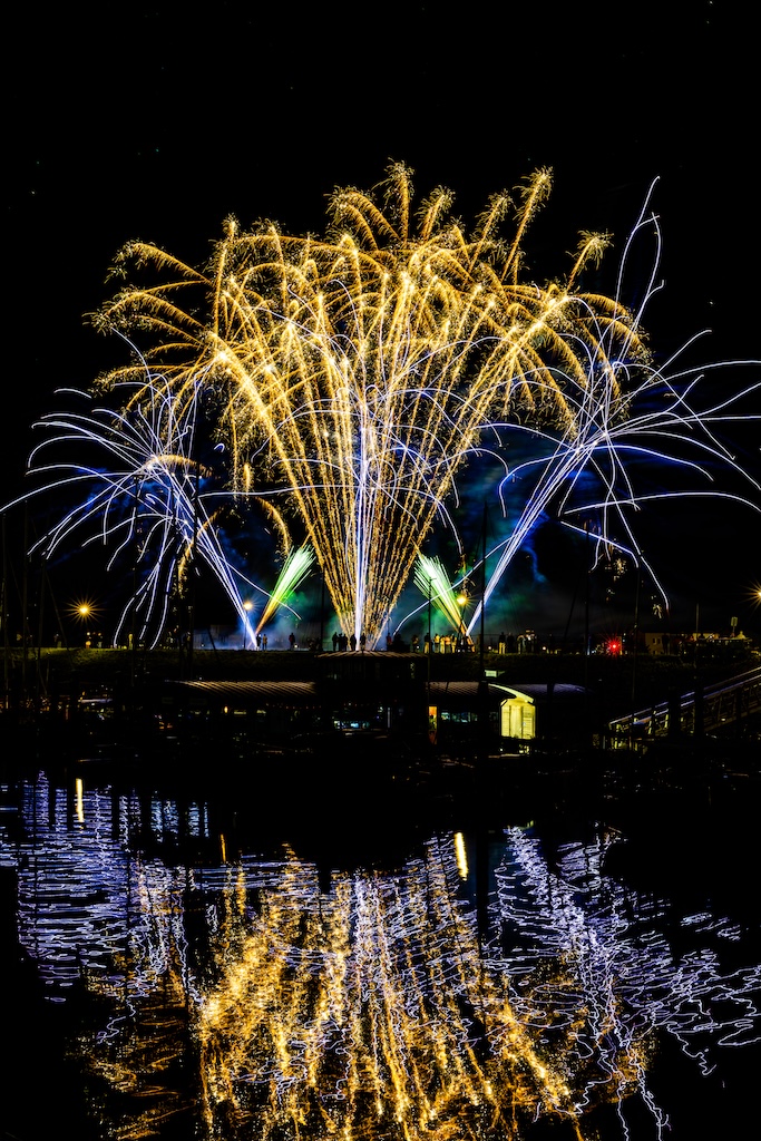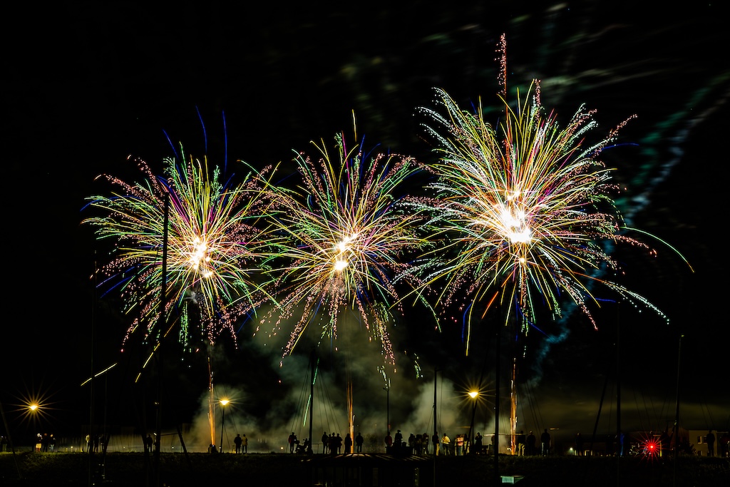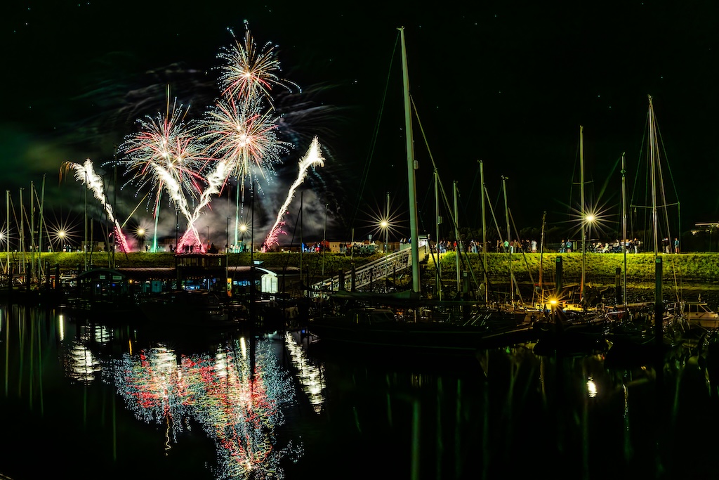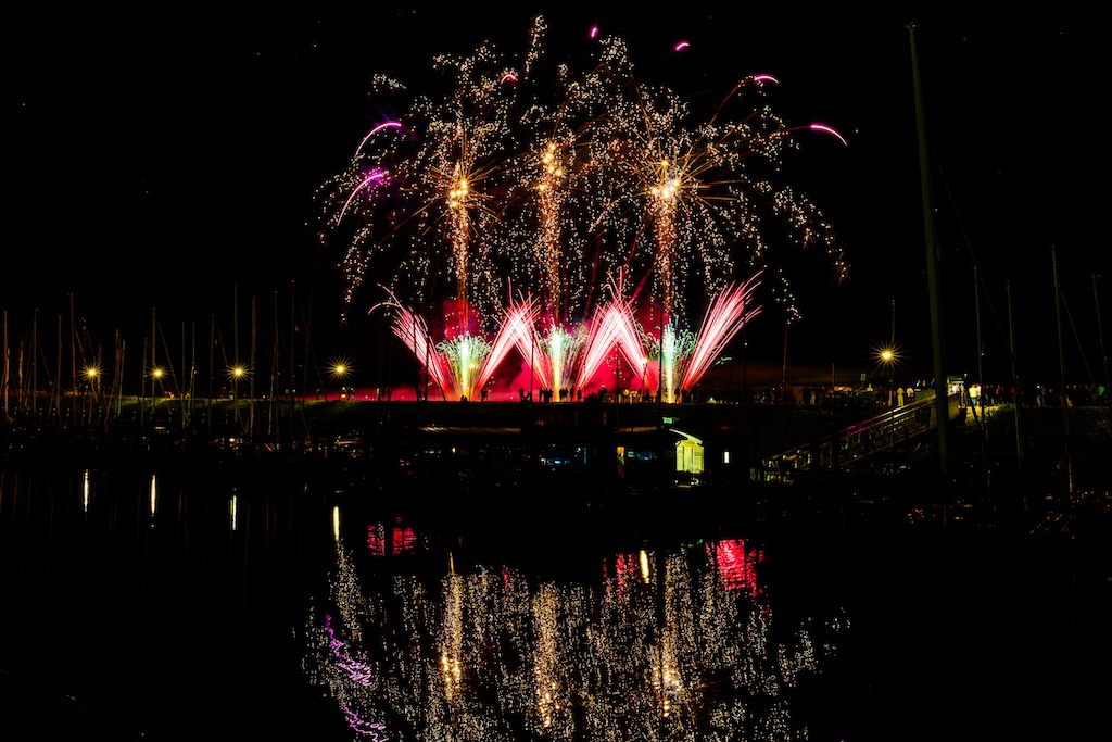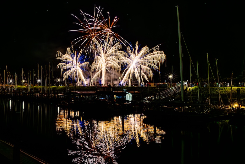 Mijn idee was om de haven met bootjes te laten oplichten door het sierlijke vuurwerk. En dat is deels gelukt! Ik stond gelukkig aan de goede kant van de haven. Maar het was erg donker, dus ik moest flink aan de foto’s sleutelen om de bootjes zichtbaar te krijgen.