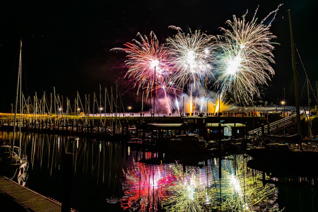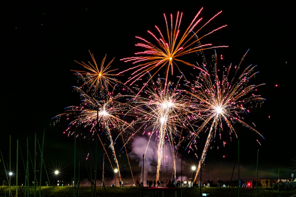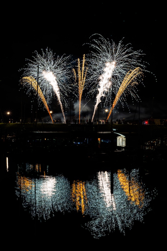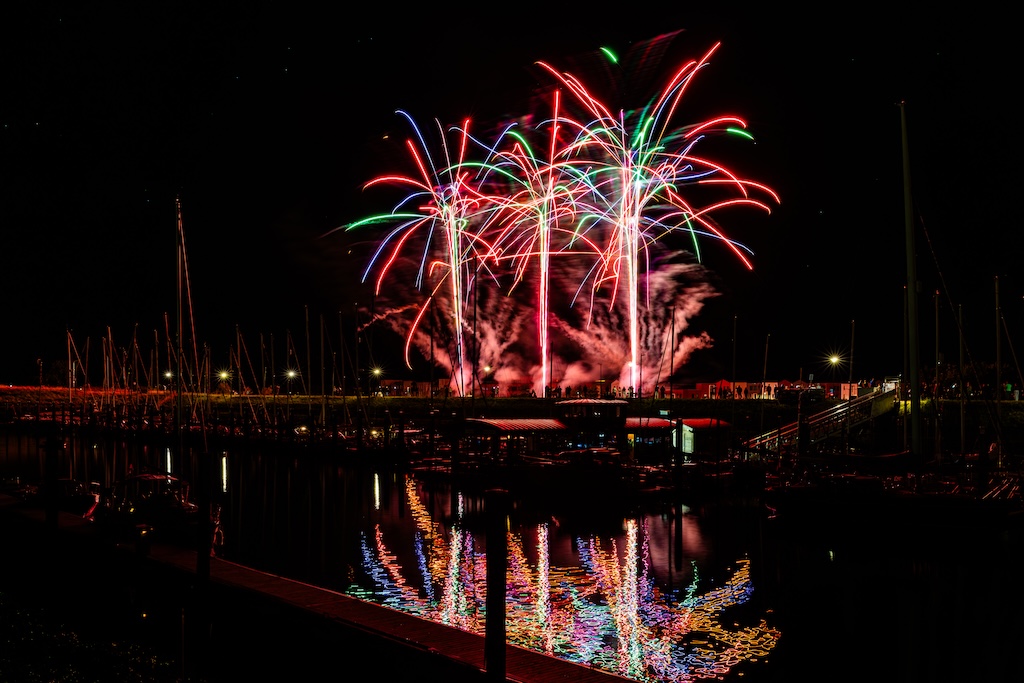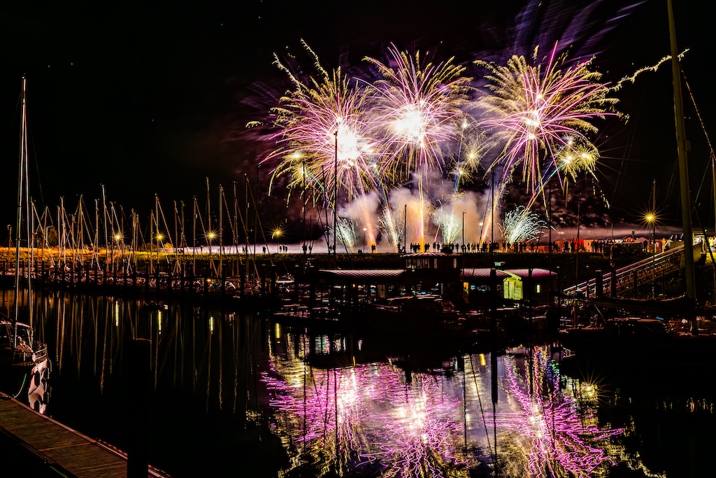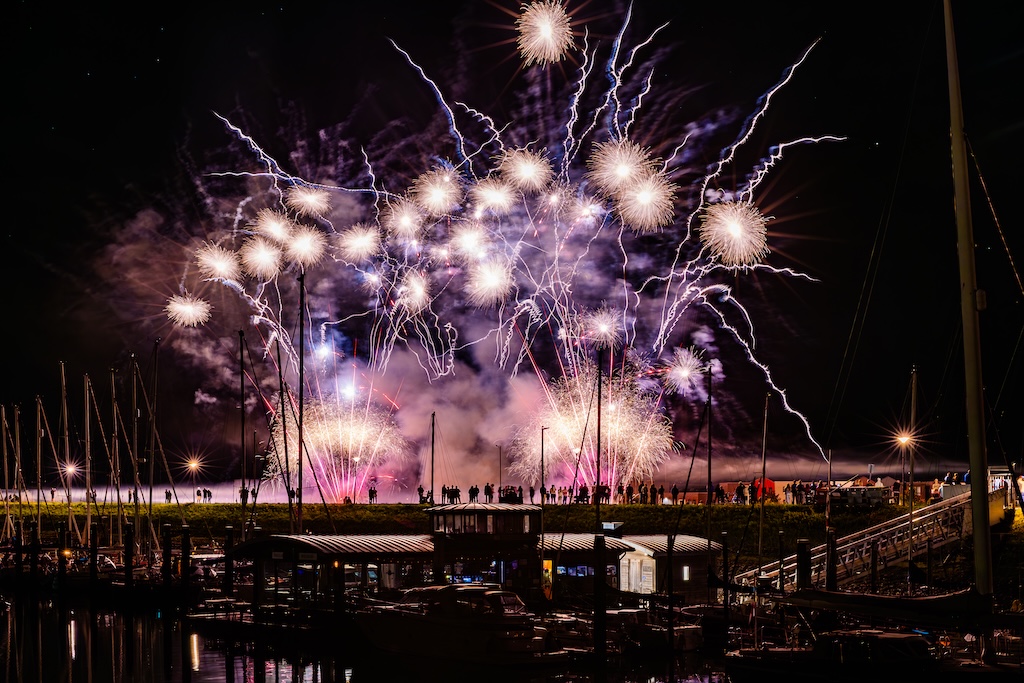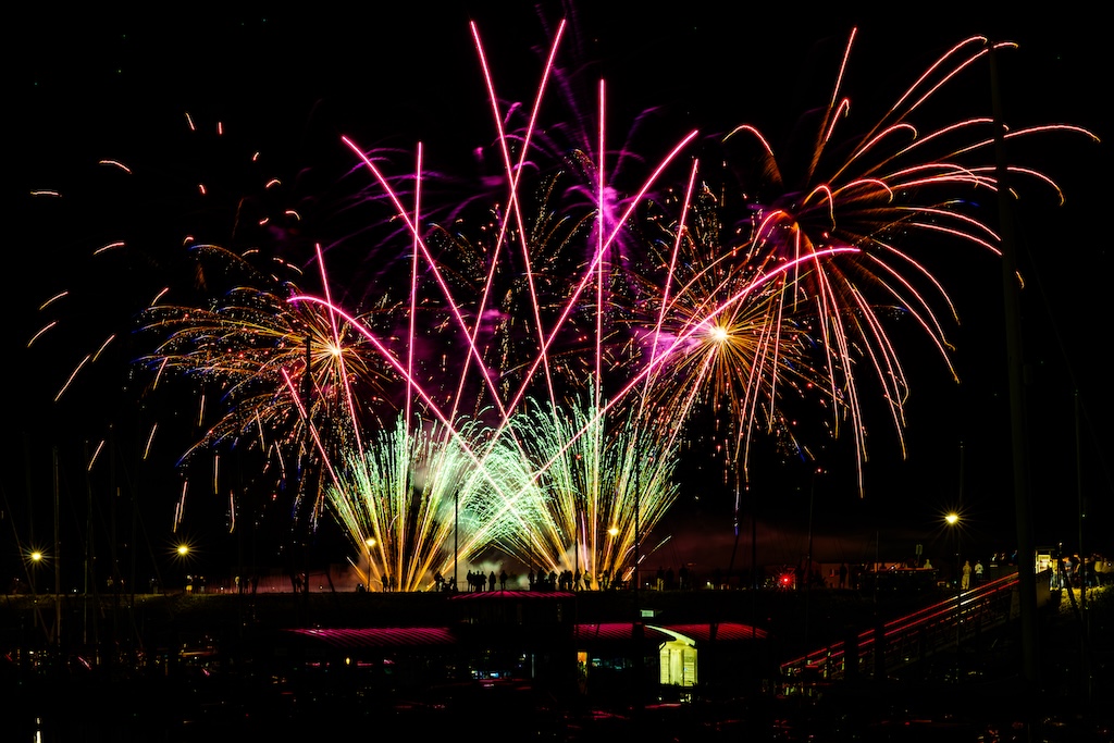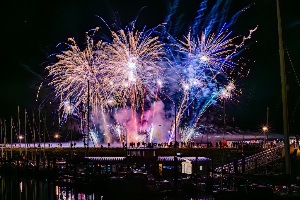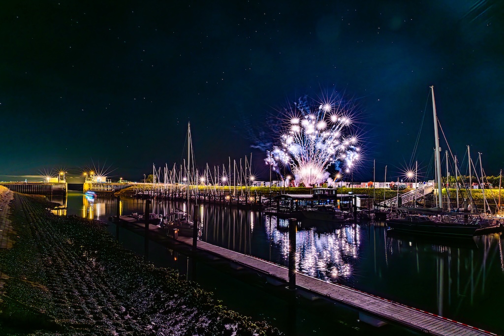 Mijn idee was om de haven met bootjes te laten oplichten door het sierlijke vuurwerk. En dat is deels gelukt! Ik stond gelukkig aan de goede kant van de haven. Maar het was erg donker, dus ik moest flink aan de foto’s sleutelen om de bootjes zichtbaar te krijgen.