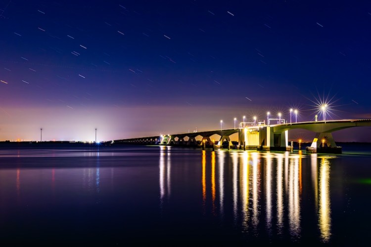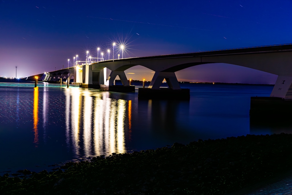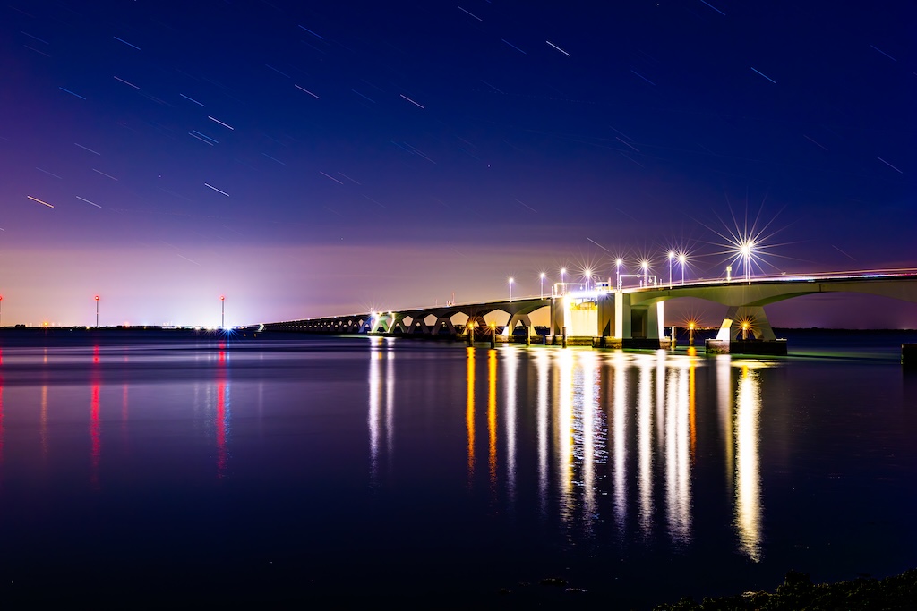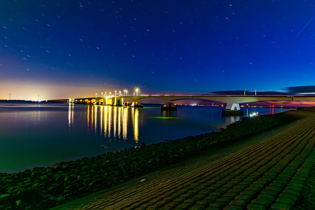 Omdat het zo donker was, heb ik een sluitertijd van maar liefst 5 minuten (!) gebruikt. Vogels fotografeer ik met een sluitertijd van bijvoorbeeld 1/1000e seconde, dus dan is het klikklikklik. Nu stond mijn sensor vijf minuten lang open om zoveel mogelijk licht op te vangen. De brug werd slechts deels verlicht door een paar lantaarns, de rest was gehuld in het donker. Een leuk bijkomend effect van zo’n lange sluitertijd is dat het water van de Oosterschelde er helemaal glad uitziet. En de sterrenhemel zijn geen sterretjes, maar streepjes door de lange sluitertijd.